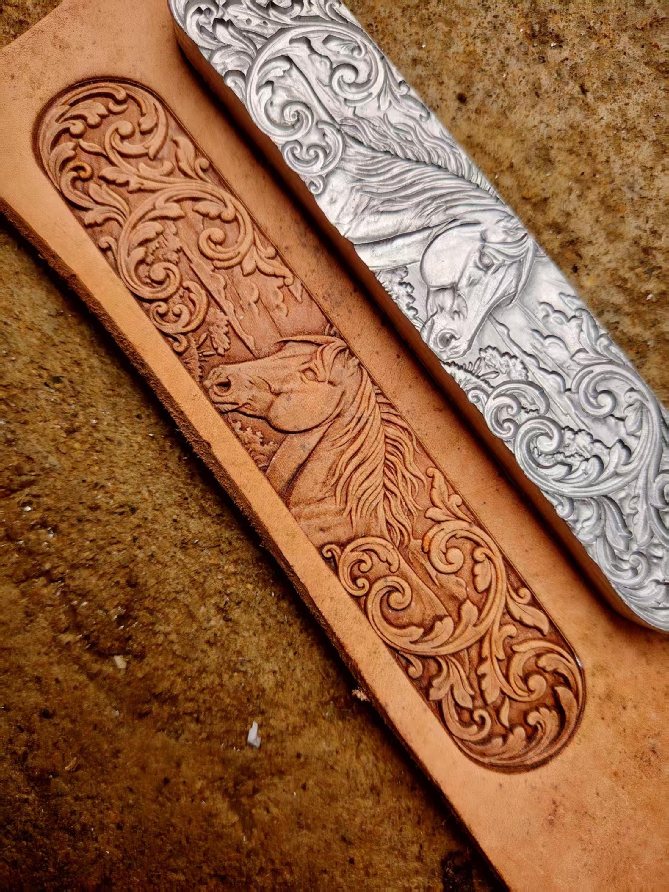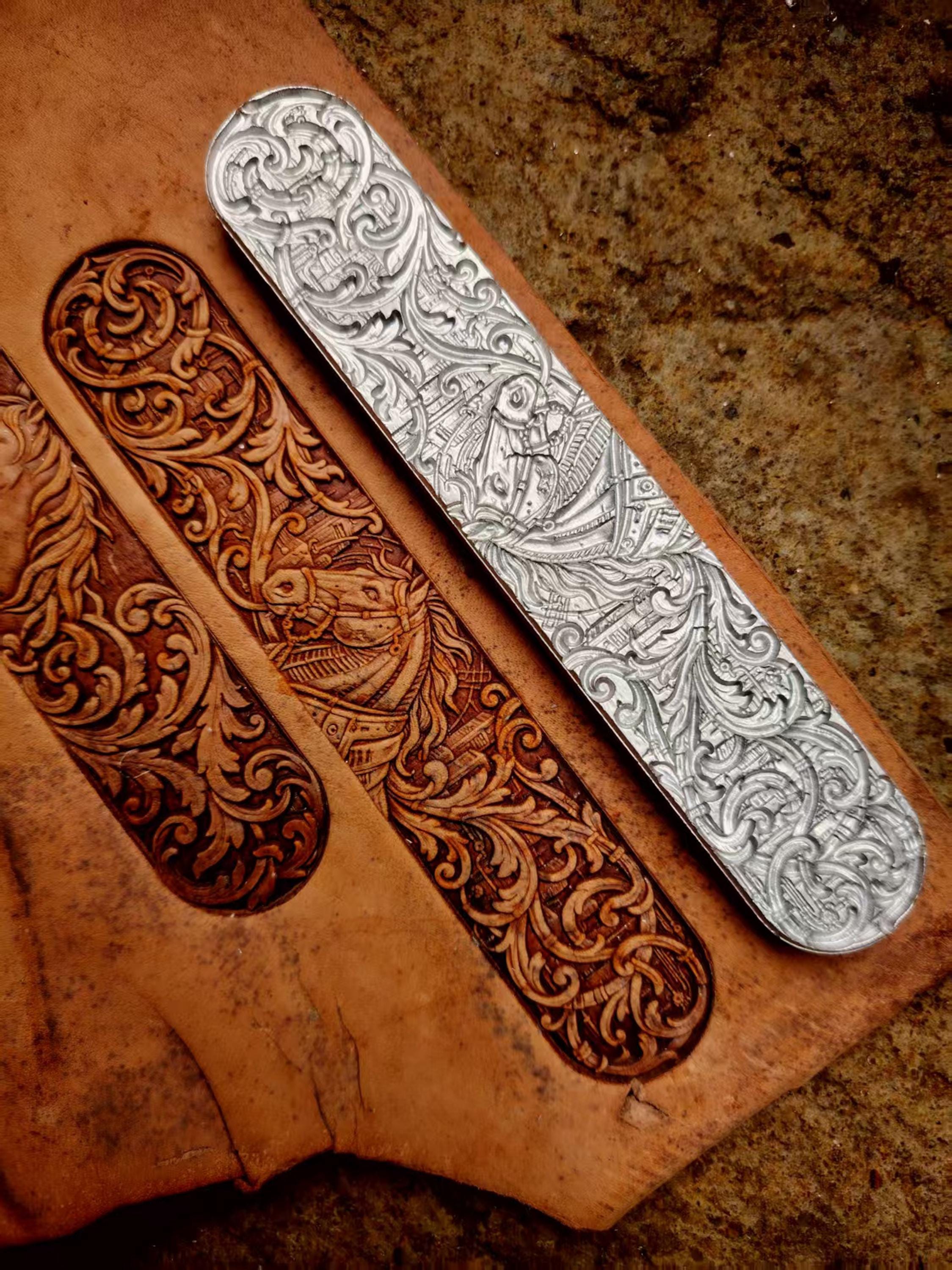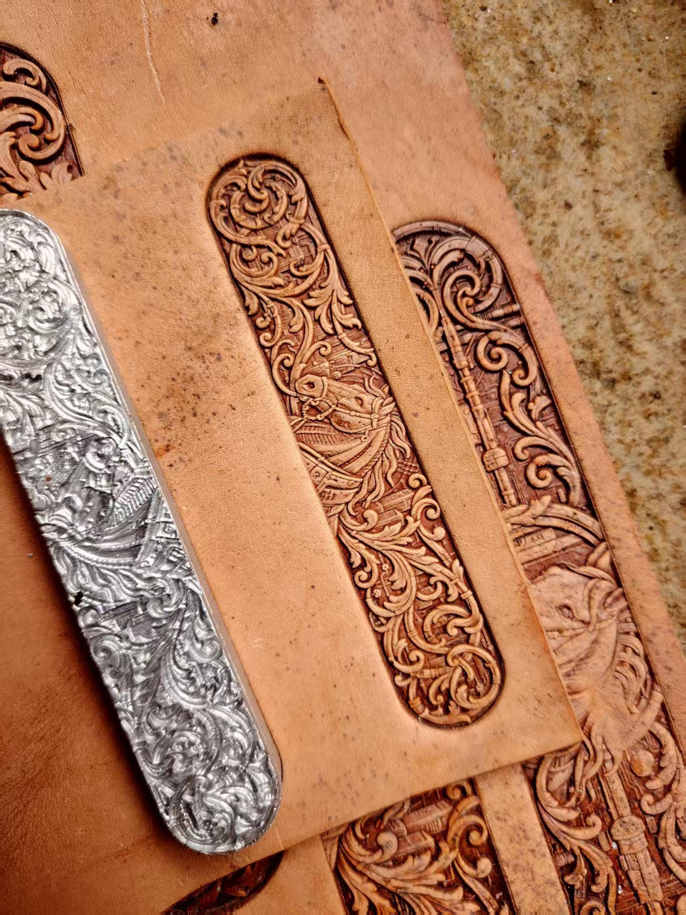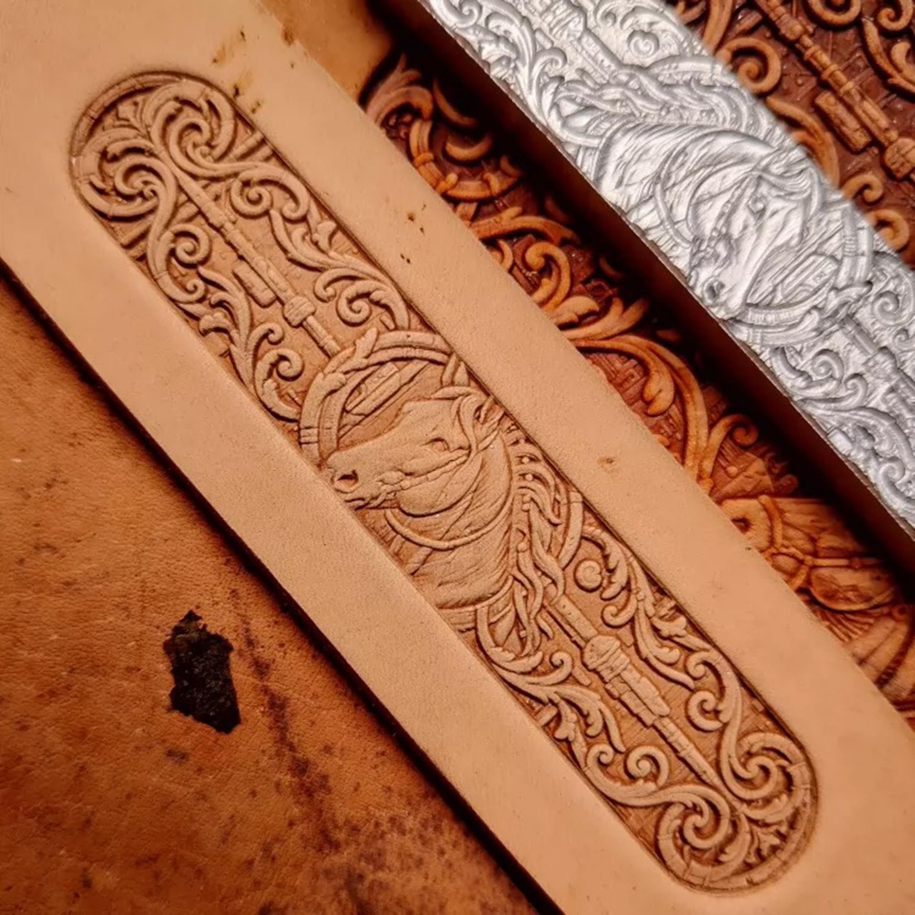 Horse head long scrolling arabesque patterned leather belt bracelet vegetable tanned leather handmade three-dimensional embossing mold