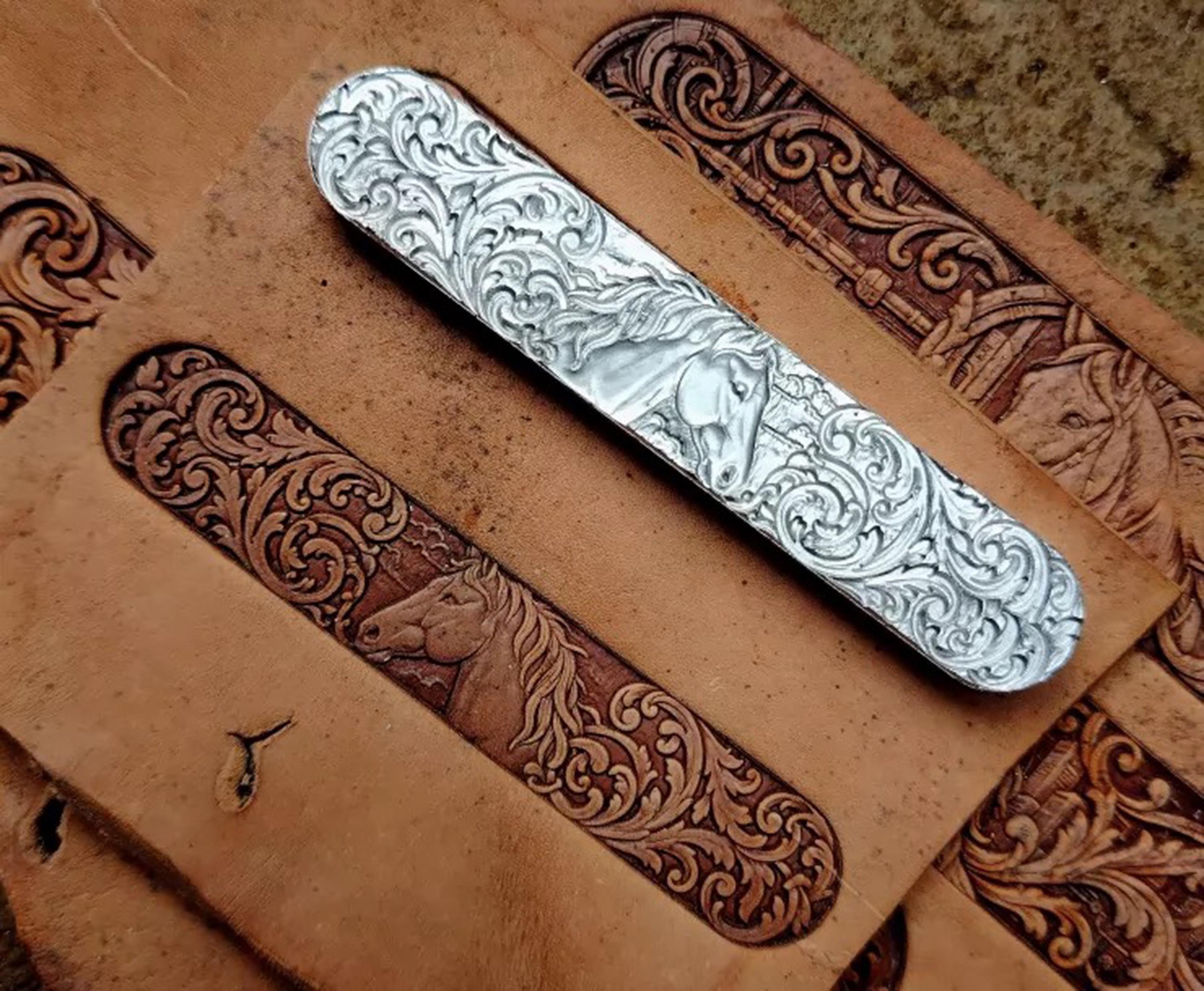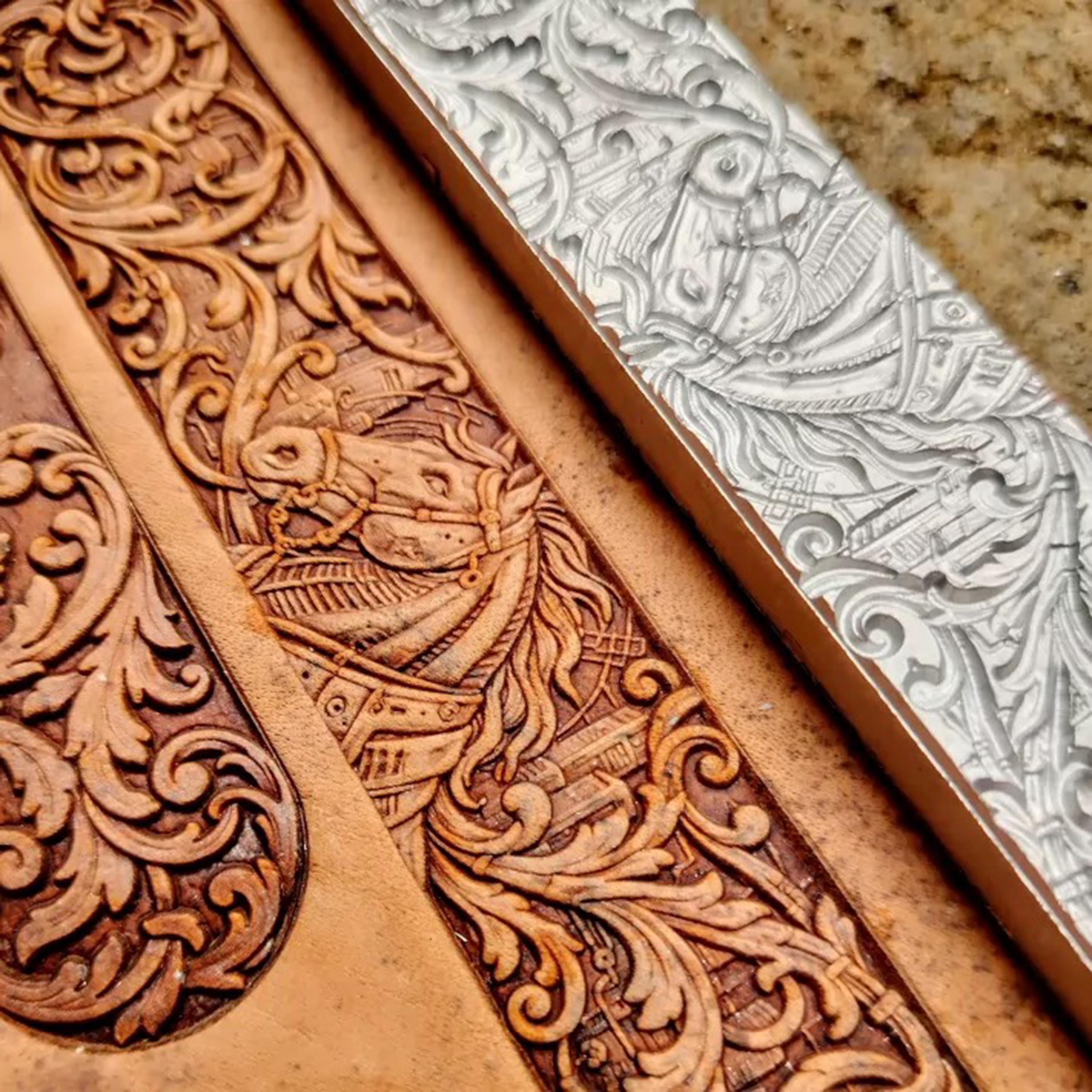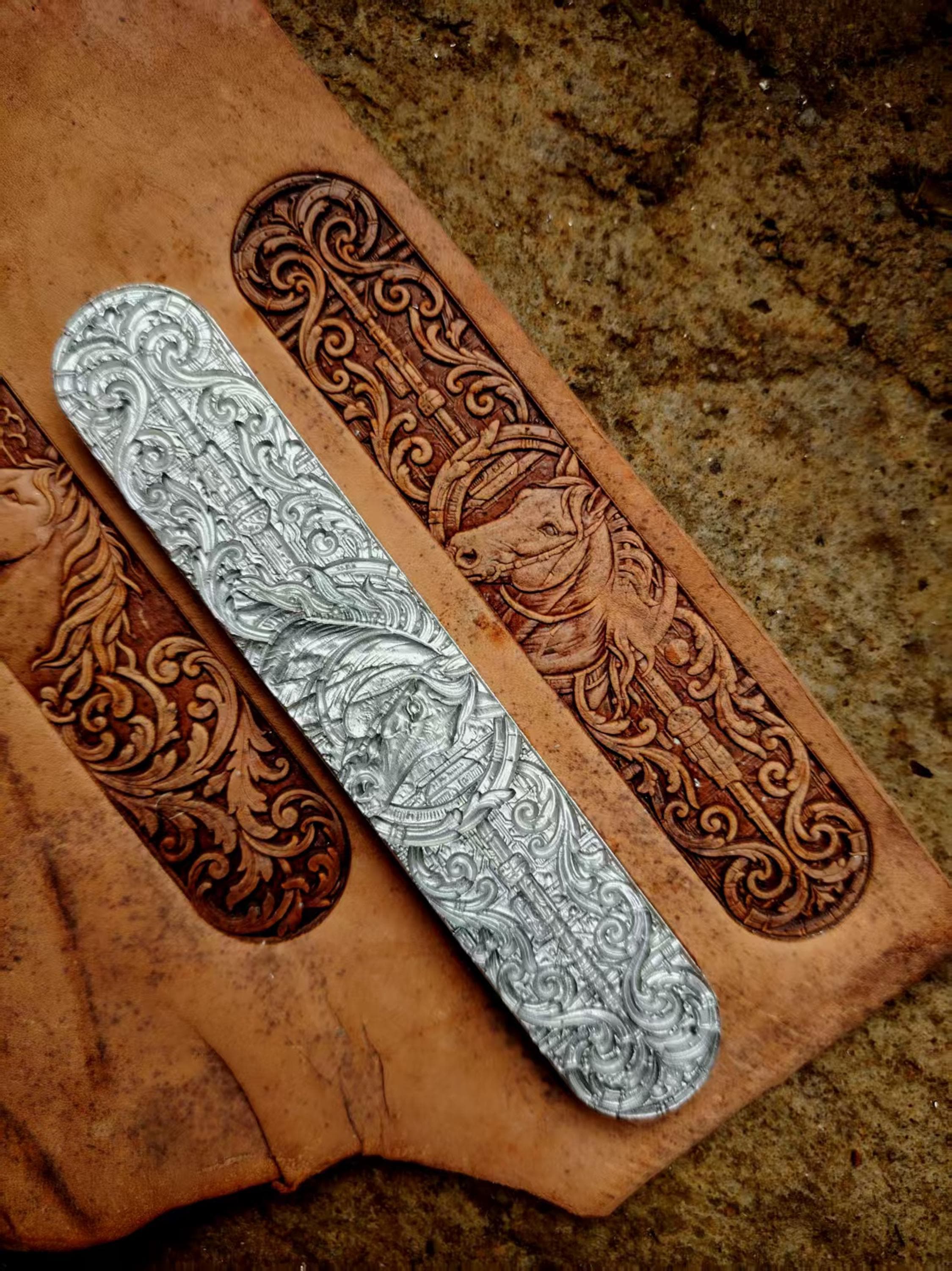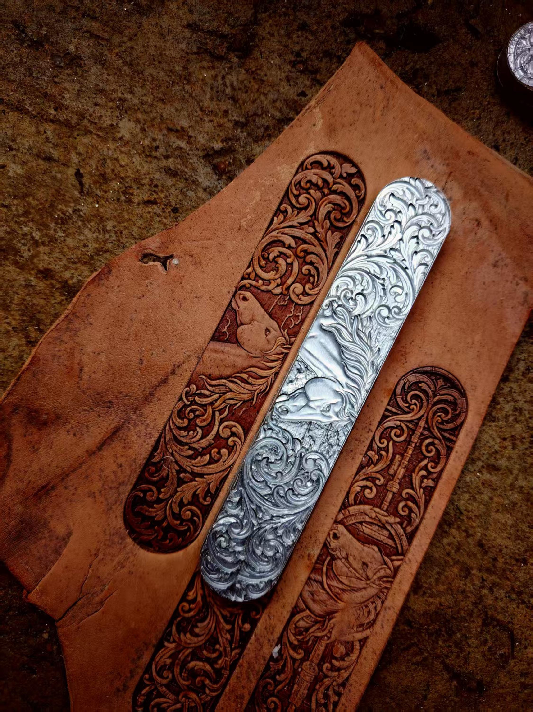 Horse head long scrolling arabesque patterned leather belt bracelet vegetable tanned leather handmade three-dimensional embossing mold