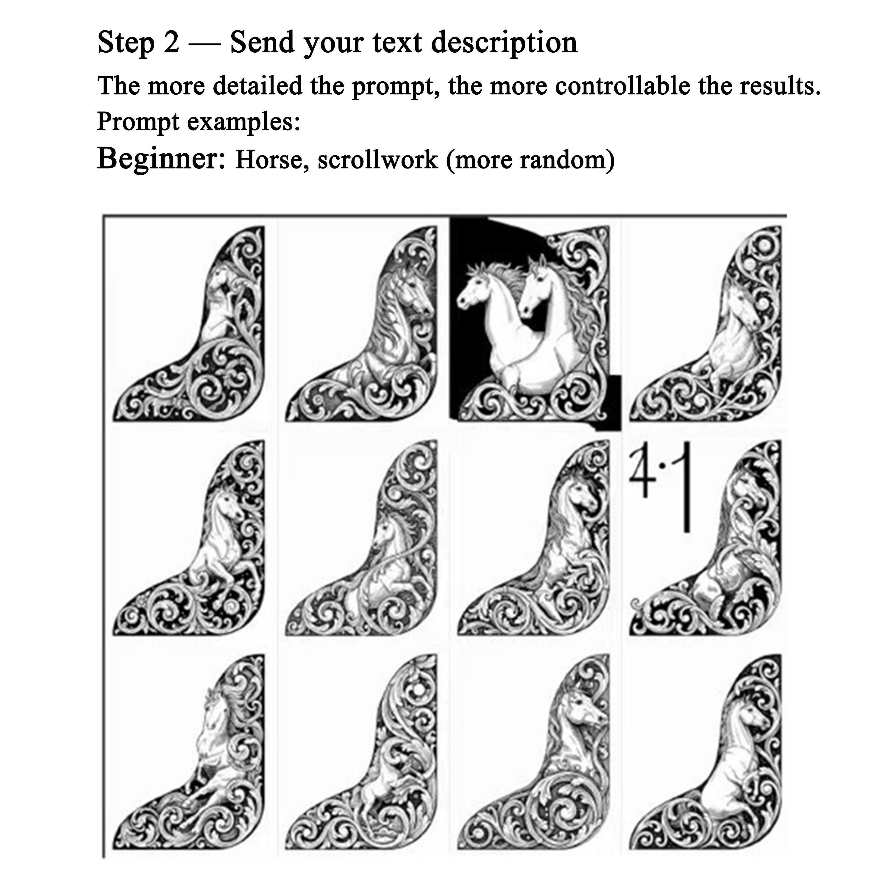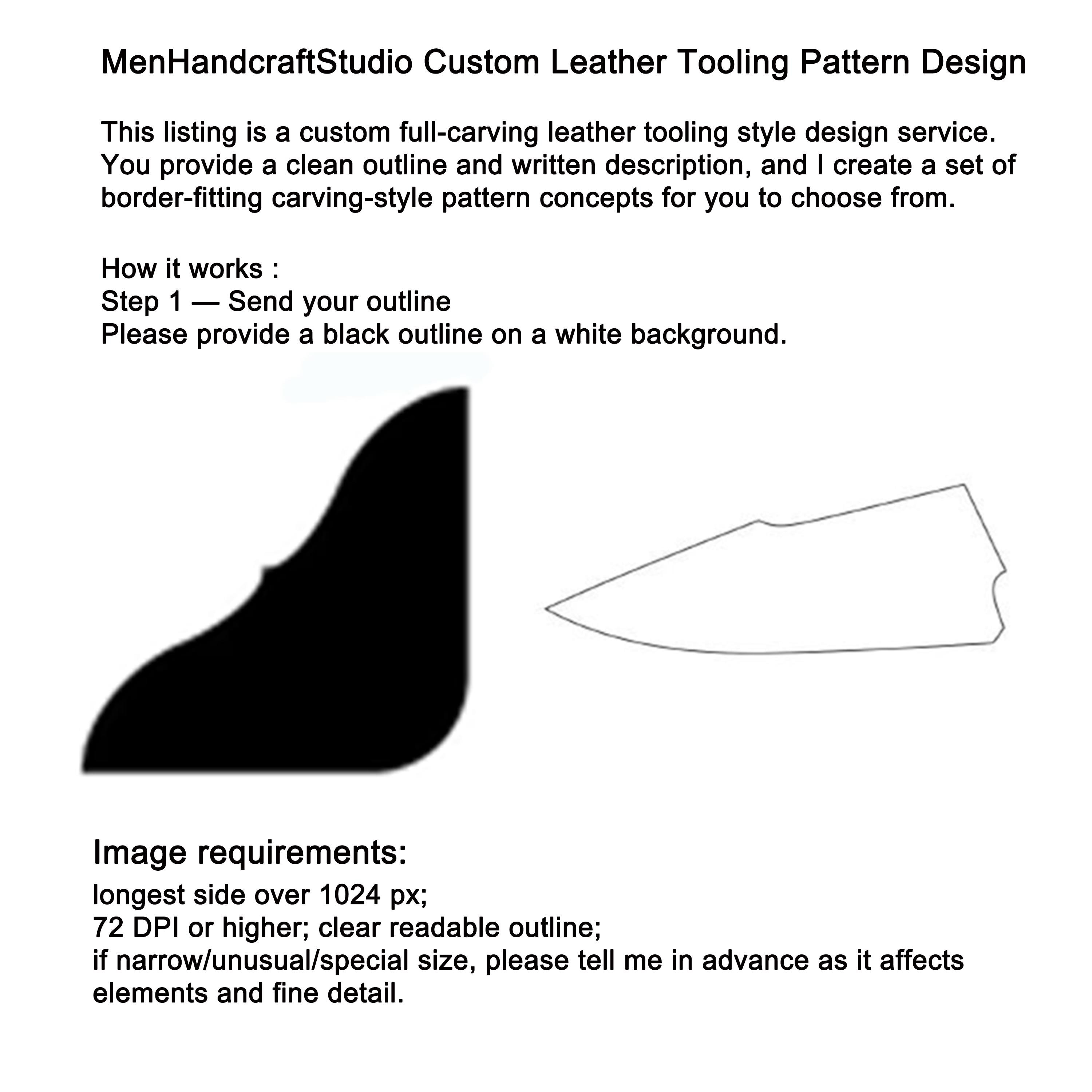 This listing is a custom full-carving leather tooling style design service. You provide a clean outline and written description, and I create a set of border-fitting carving-style pattern concepts for you to choose from.