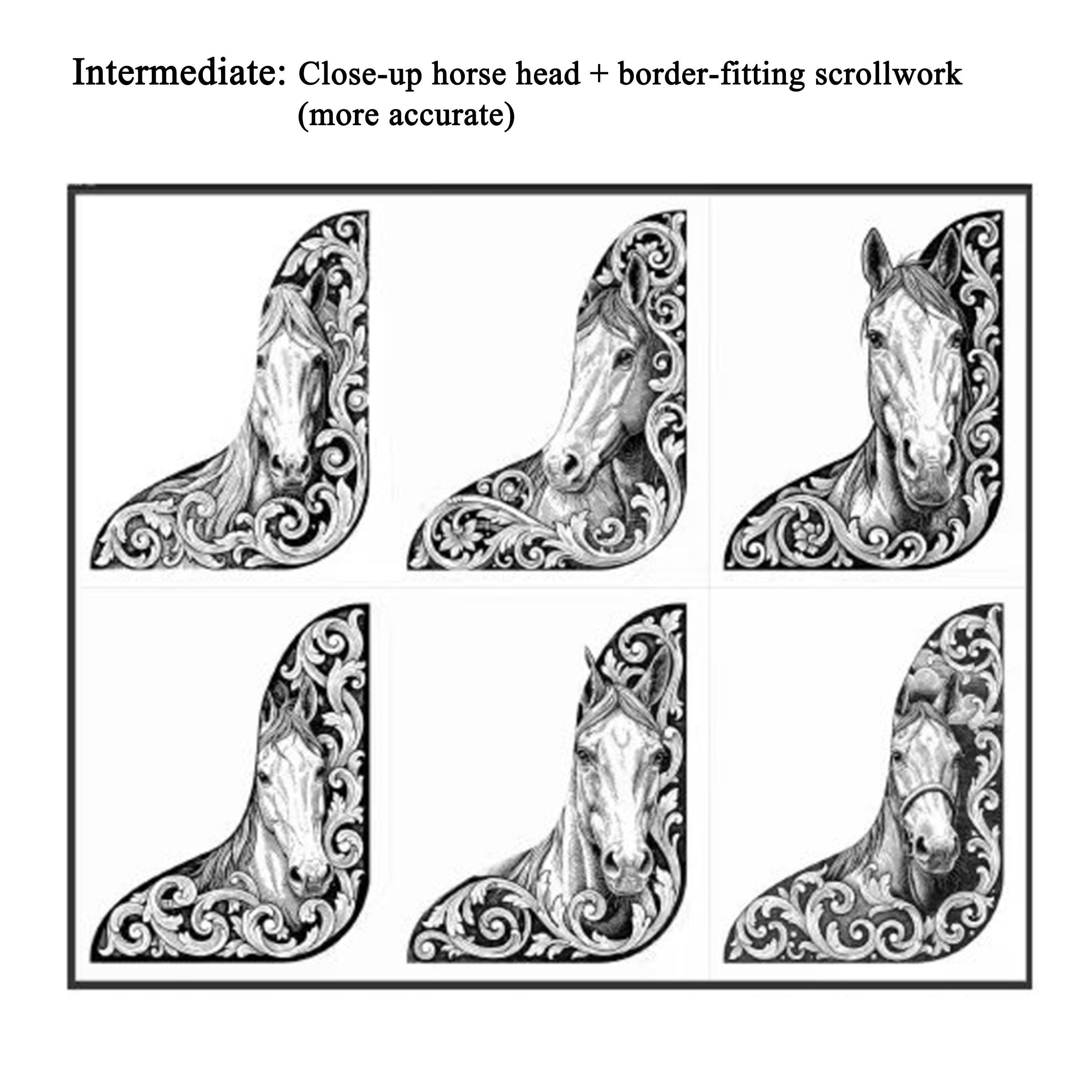 -Intermediate: Close-up horse head + border-fitting scrollwork (more accurate)