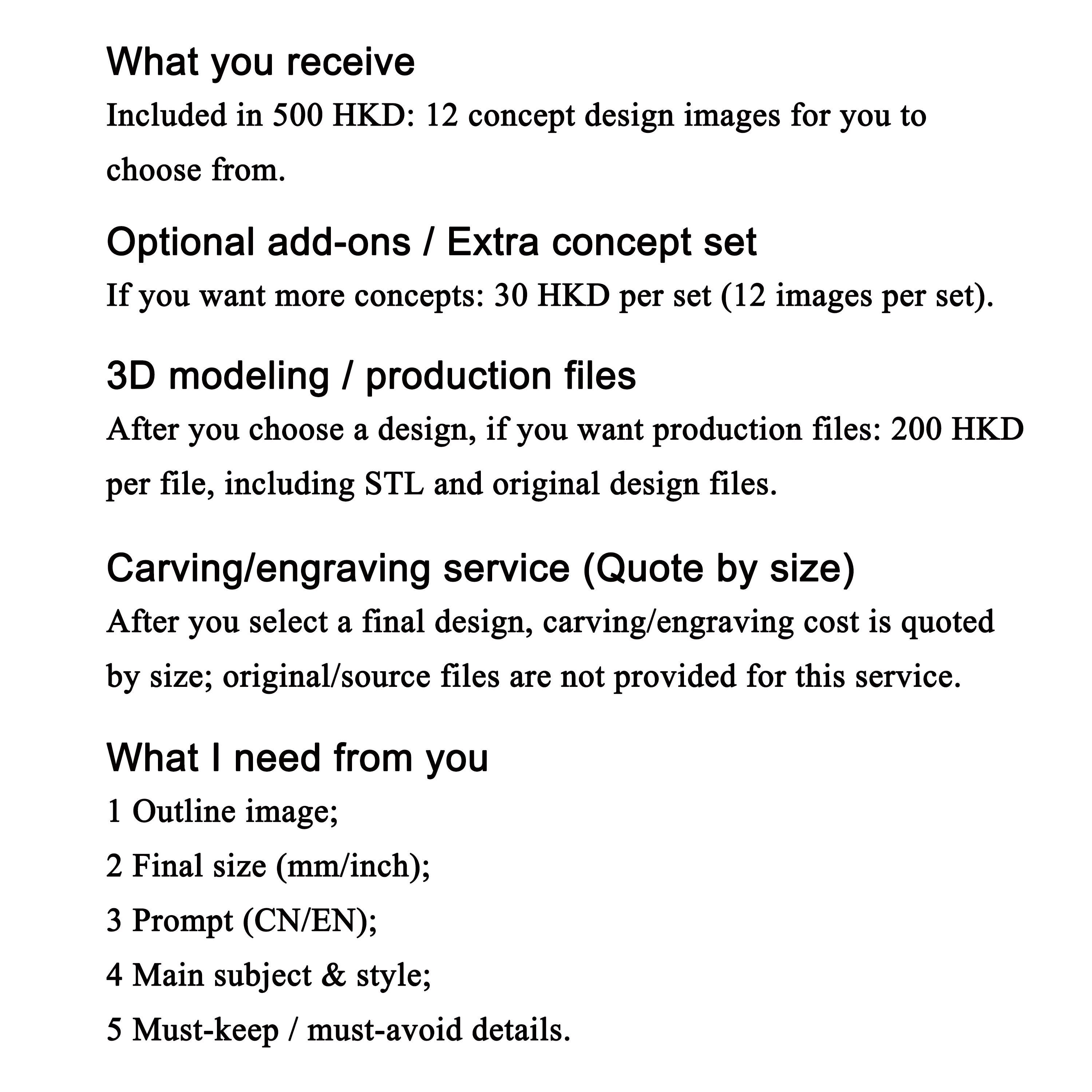 Included in 500 HKD: 12 concept design images for you to choose from.